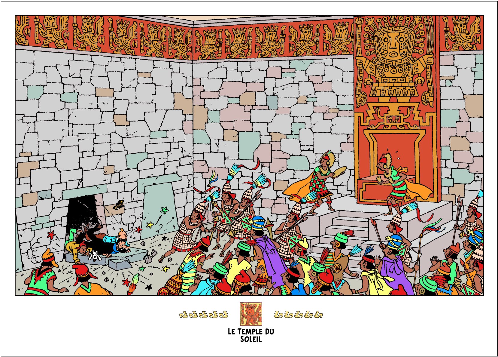 This Tintin poster shows the moment in Prisoners of the Sun when Tintin, Captain Haddock, Zorrino and Snowy tumble into the Inca meeting by accident.